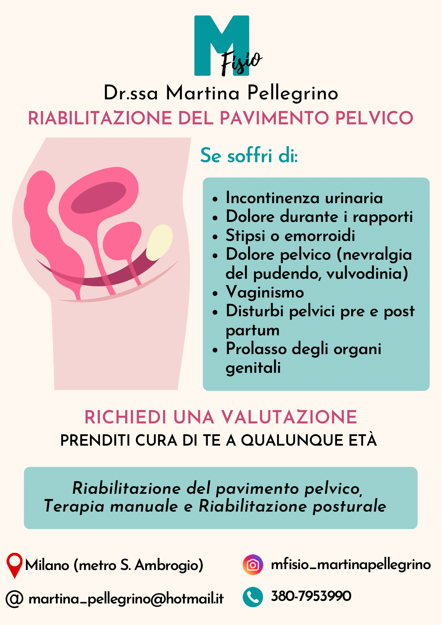 Mi occupo di riabilitazione del pavimento pelvico sia nella donna che nell’uomo. Il mio compito è di strutturare, attraverso una corretta anamnesi e indagine valutativa, un trattamento riabilitativo idoneo per quel paziente. Lo scopo è recuperare una disfunzione e cooperare al recupero di una funzione corporea persa. Nel caso della riabilitazione pelvica bisogna indagare bene i sintomi e la storia clinica del paziente, applicare tutte le nuove tecniche in ambito riabilitativo e rieducare al recupero funzionale. Mi occupo di: dolore pelvico, dolore durante i rapporti, disfunzioni pelviche legate a traumi del vissuto, incontinenza urinaria, prolassi ed emorroidi. Mi avvalgo spesso di elettrostimolazione e biofeedback per rendere il lavoro ancora più completo, e chiaramente della terapia manuale.